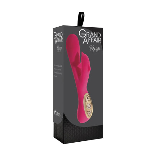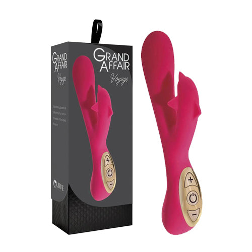 Plunge into 12 modes of unknown depths of pleasure with the Voyage rechargeable vibrator! Dual motors in the dolphin-shaped stem and smooth shaft provide simultaneous clitoral and vaginal stimulation in this whisper-quiet pleasure tool. Play with 3 levels of escalating vibration and 9 unique rhythmic patterns. The beautiful Gold Edition 3-button control pad features LED indicator lighting so that you can see what you are doing in the dark.This vibe is rechargeable in under 2.5 hours, has a travel-lock, and is even waterproof for bath time indulgence. The virtually seamless SiliconeSilk is phthalate-free and can be preserved by using only water-based lubricants. Clean with soap and warm water or toy cleaner before and after use.