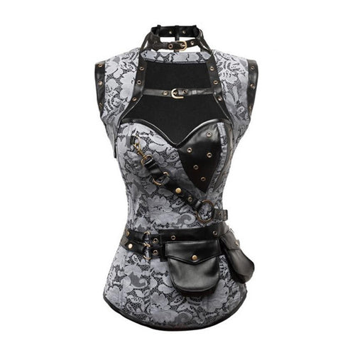 Steampunk gray waist reducer with steel rods. A lovely corset that transforms your waist into a guitar body. It has a side cream for easy placement. It has a matching torero and several decorative buckles. A beautiful corset for the most retro futurists.Steampunk derived from the Victorian era has a unique charm, incorporating retro-futuristic technology and aesthetics inspired by steam-powered industrial machinery and significantly impacting fashion, culture, and art. Then the steampunk corset came into being. This corset contains steampunk elements, like buckles, lace, embroidery, and retro colors to complete a steampunk outfit. When you wear it, you seem like staying in the steampunk scene as the novel, games, or drama showed off. If you are interested in it, let's explore the fantastic steampunk world!