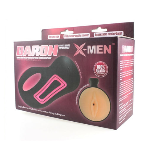 Stroke, shiver and squeeze your way to blissful release with the X-MEN Baron. A masturbator that offers lifelike pleasure and then some augment authentic pleasure with the multiple vibration setting or squeeze the sides to tailor pressure. The texture canal features ribs and nodules to stimulate the frenum and shaft, while squeezable sides enable you to imitate realistic vaginal clenching and fully customize your pleasure.To enhance your masturbation experience, we suggest using lube. Just be sure to check the lube specifications for your masturbator, as certain materials pair better with some lubes than others. Always clean your sex toy immediately after use according to the manufacturer's instructions.